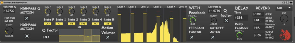 Monotale Resonator. 6 resonating bands, plus Reverb and Tape Delay. Two pole filters, High Pass and Low Pass. Motion factor for bands volumen, resonating factor, and filters Q & Cutoff. Frequencies can be controlled by modulating or via Midi. Mac OS & PC