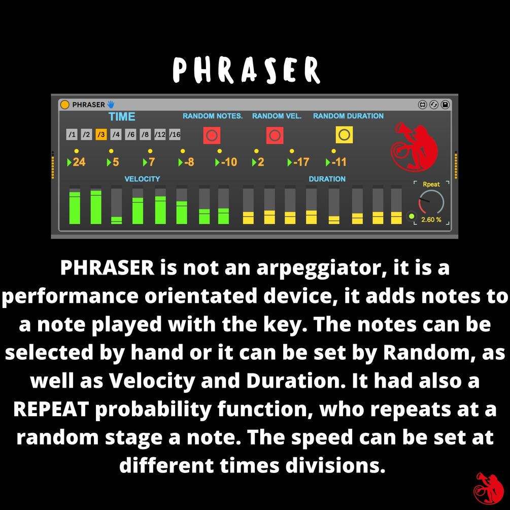 PHRASER is not an arpeggiator, it is a performance orientated device, it adds notes to a note played with the key. The notes can be selected by hand or it can be set by Random, as well as Velocity and Duration. It had also a REPEAT probability function, who repeats at a random stage a note. The speed can be set at different times divisions.