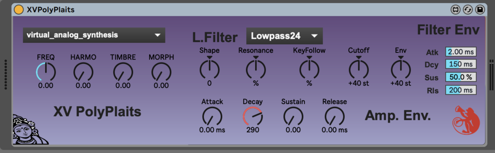 Xv PolyPlaits 6 voices of polyphony of the super acclaimed Mutable Instruments Plaits Macro Oscillator, plus a Ladder Filter and Amp. Envelope as well a filter envelope.